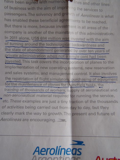 The 3 hour flight is bumpy, as we break cloud cover coming in to land in Ushuaia with mountains towering above us, the Aerolineas Argentinas engines are wound up and we start to climb, steeply…. the inflight magazine (see pic) is not helping our confidence…. strangely for a company bio, it draws attention to “the aim of turning around the technological backwardness and state of abandonment generated by over 10 years of private administration when not a single cent had been invested” hmmm… hope at least some of the instruments are working today.