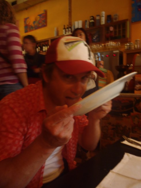 Matt! Didn’t we teach you any manners. One must always take ones hat off when licking ones plate!
