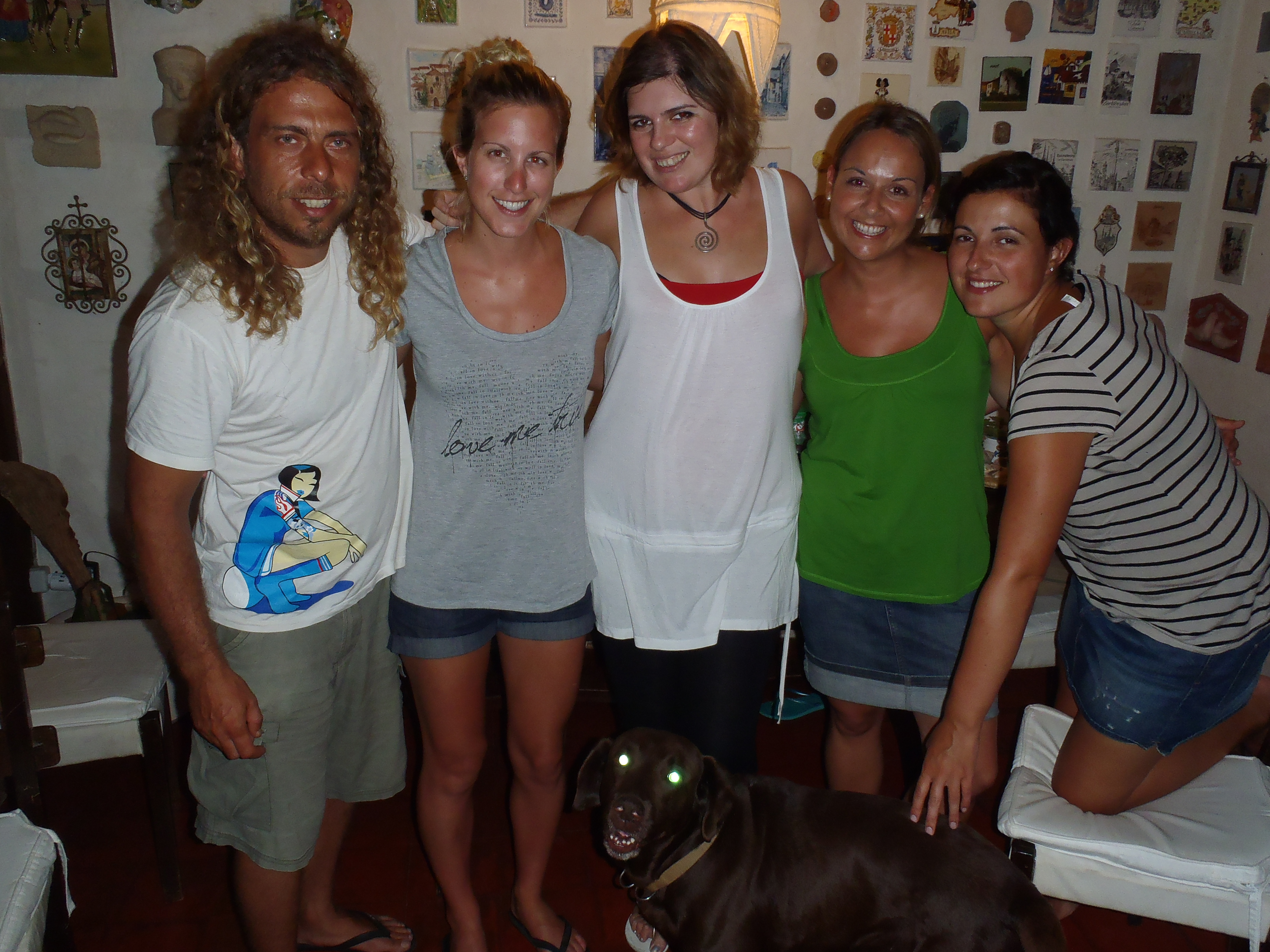 surfie hostel owner Rodrigo, me, Begona, Emma, Nuria & Hush
