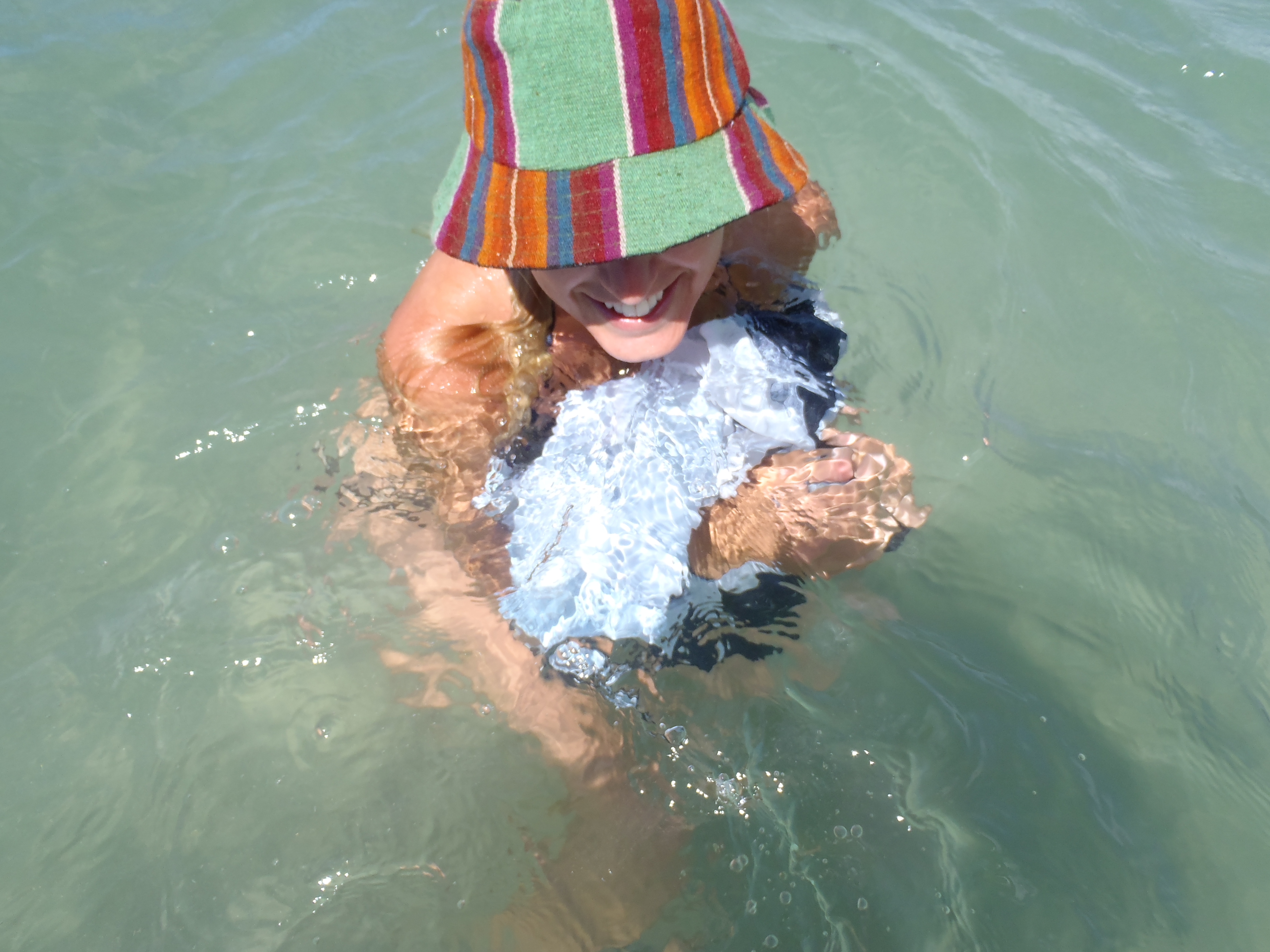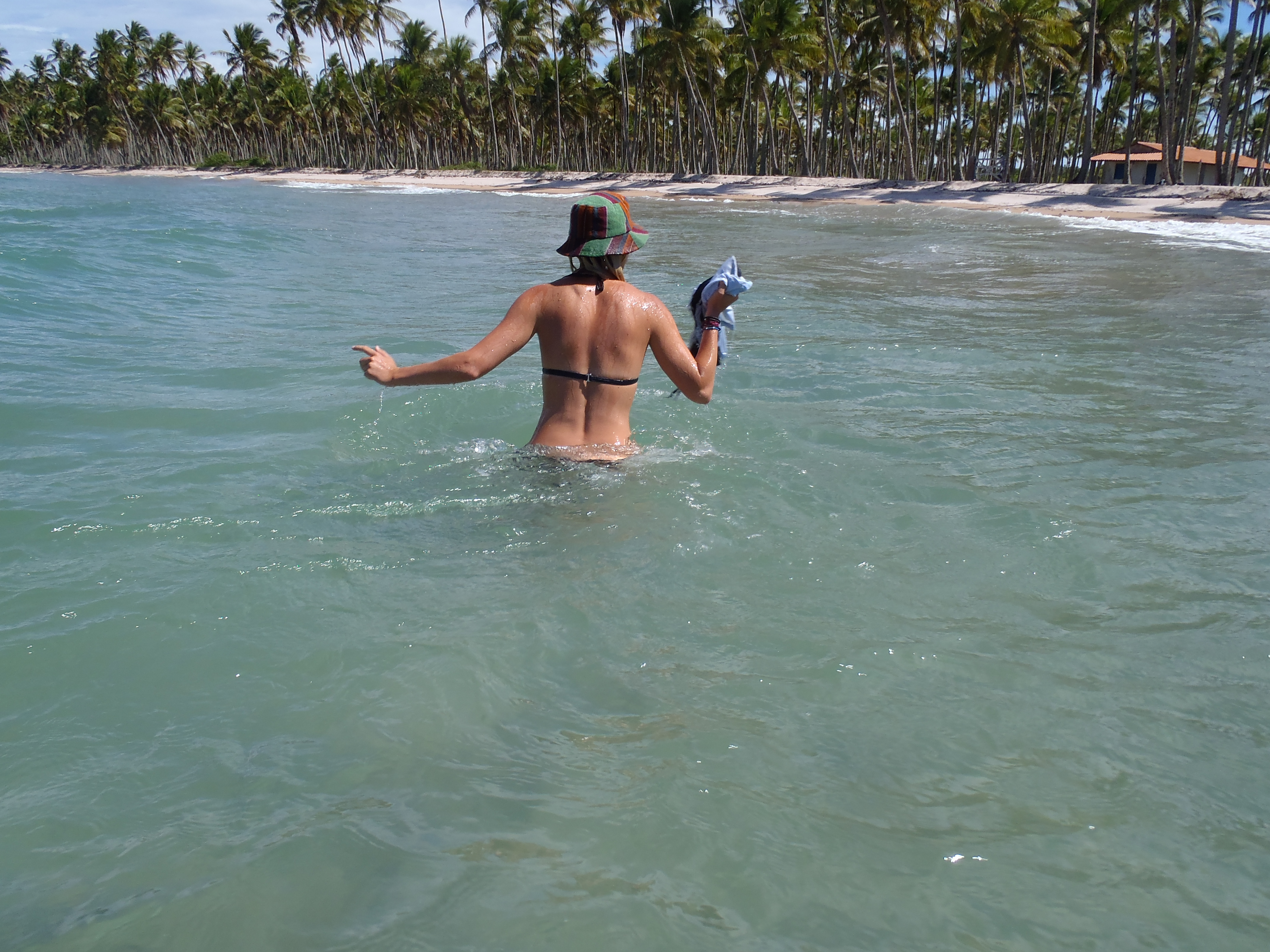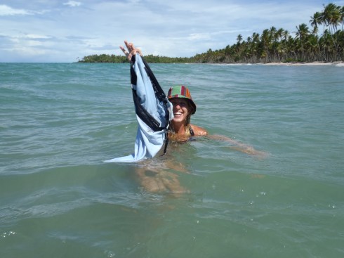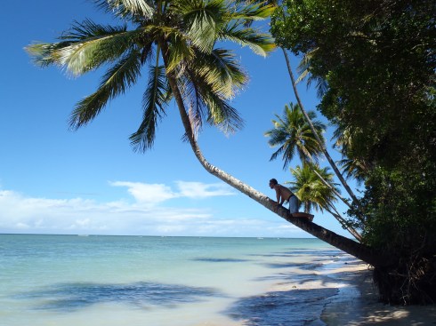 Over the next couple of days we explore more of the coast, bags on our head we wade through rivers to reach Praia do Morere – again it seems like we have half the island to ourselves, it’s amazing. I climb palm trees, Kelly steals my boardshorts; you have to make your own fun on deserted islands!
