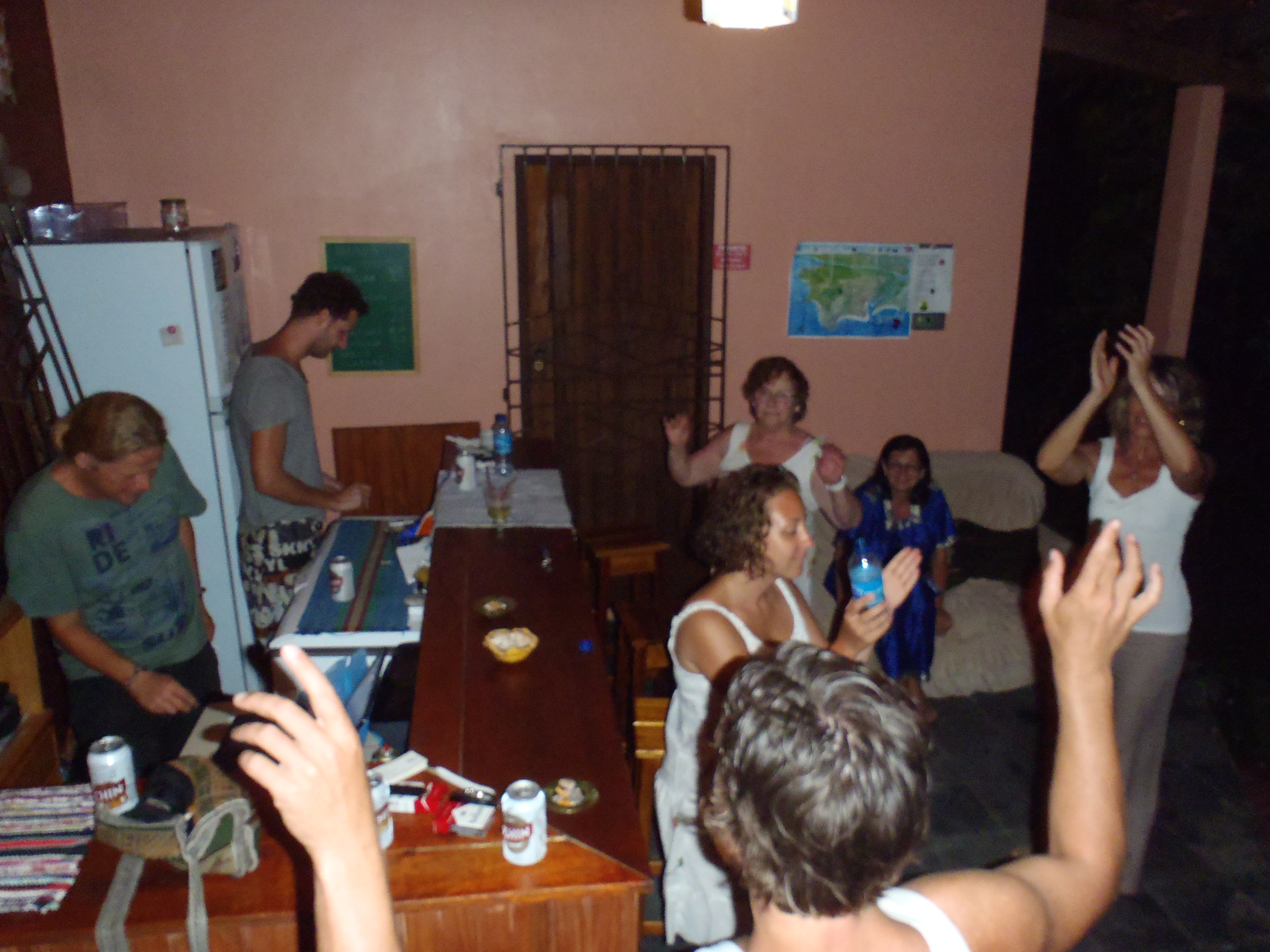 As the sun sets, the shadows lengthen over the beach – we walk back to the hostel; tonight a party is planned for Peter’s mother, visiting from Belgium, who is turning 67 – we are joined by Leo et al from last night for a barbeque – the party goes ‘til 4am and beyond with Peter’s mum the star turn…