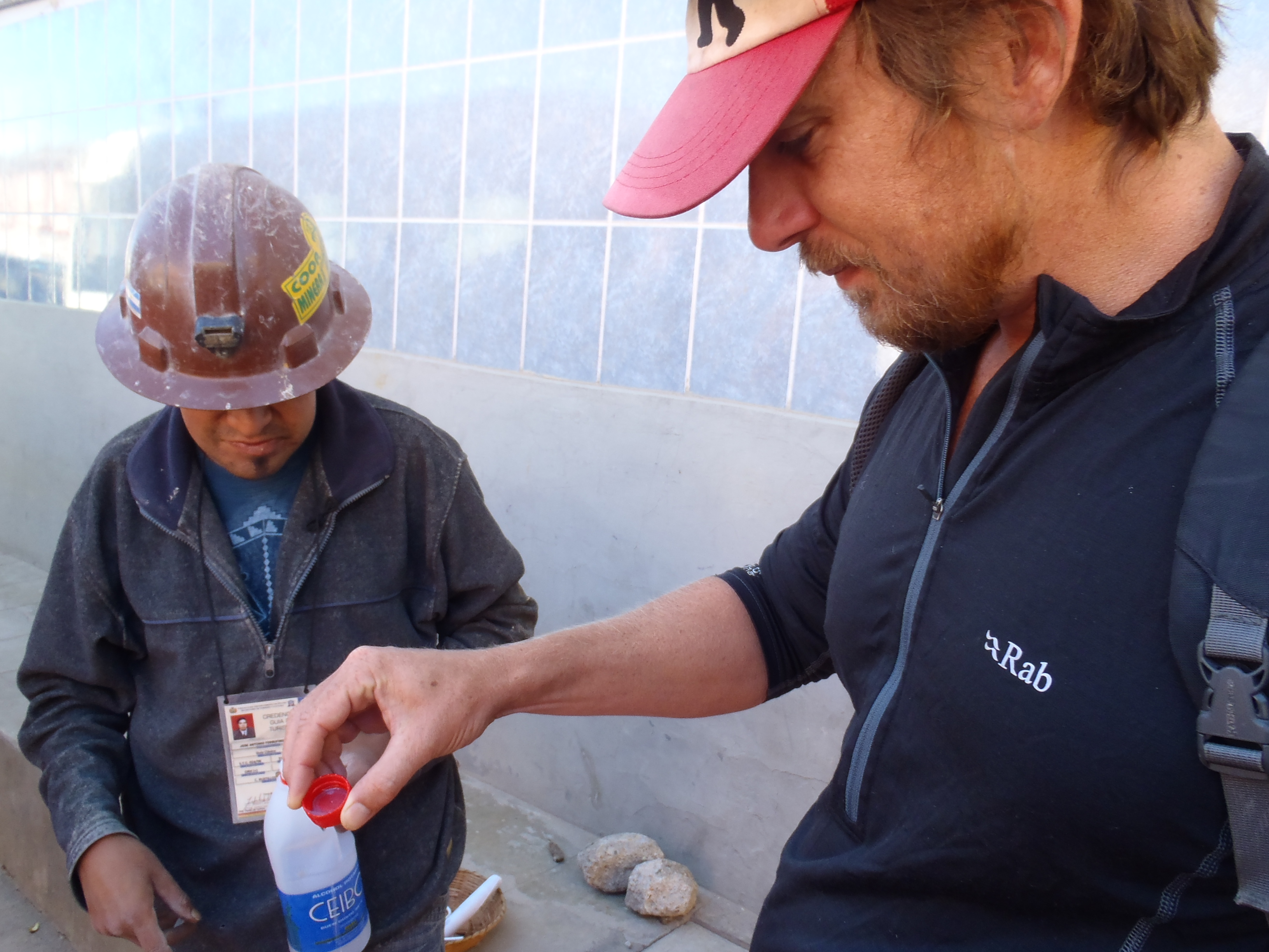 The tour begins at the miners market where we can buy gifts for the miners. The most precious items are coca leaves (to stem hunger and toilet trips), alcohol (95%) and cigarettes (traditional tobacco mixed with coca leaf). Rodrigo insists we try before we buy. MC, of course, will give anything a go…