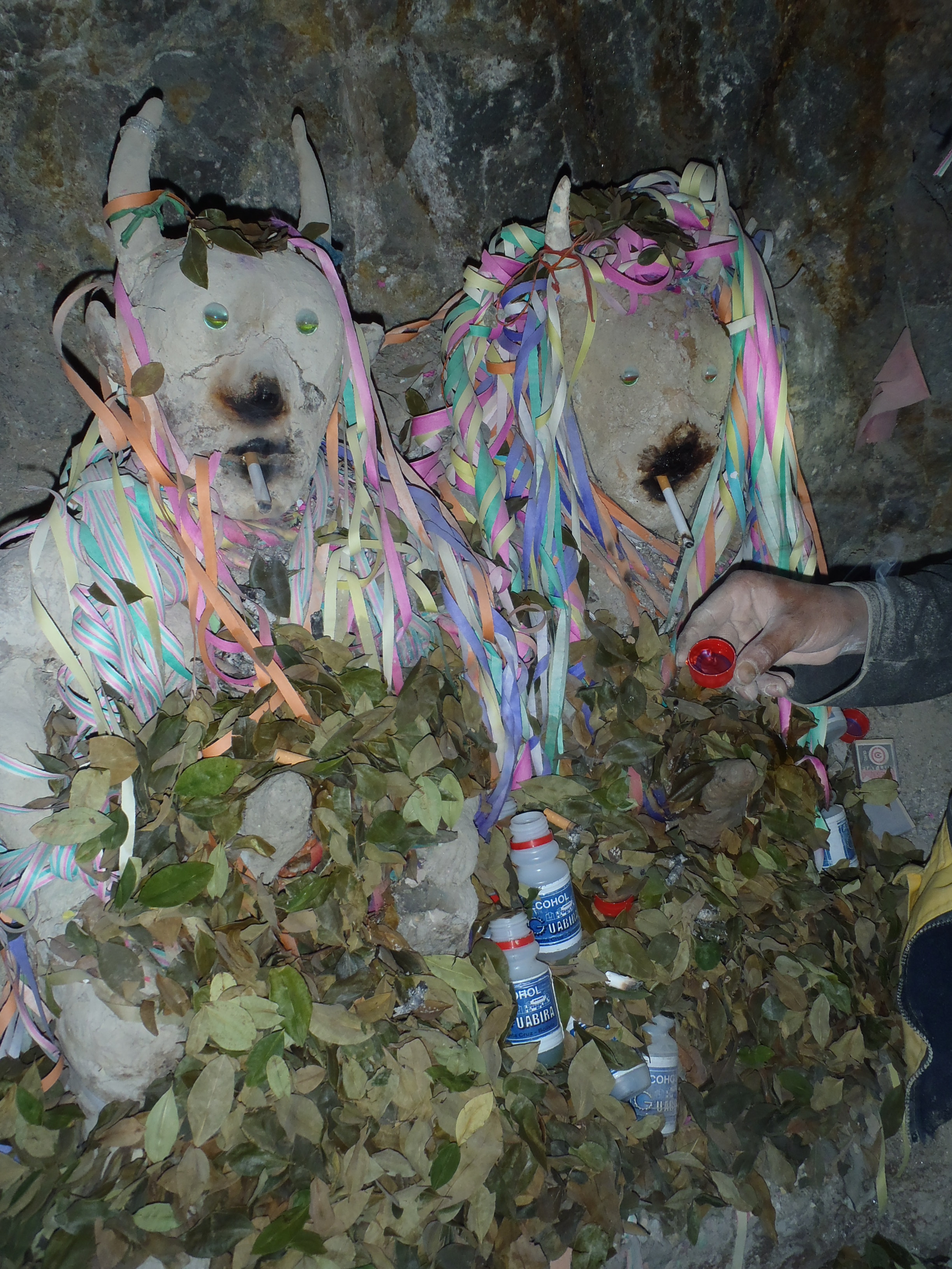 We light a cigarette in Tio’s mouth, and sprinkle a little coca leaves and alcohol on his hands and feet (to keep the miners safe) and on the penis (to give the miners fertility).