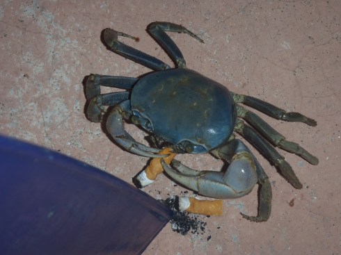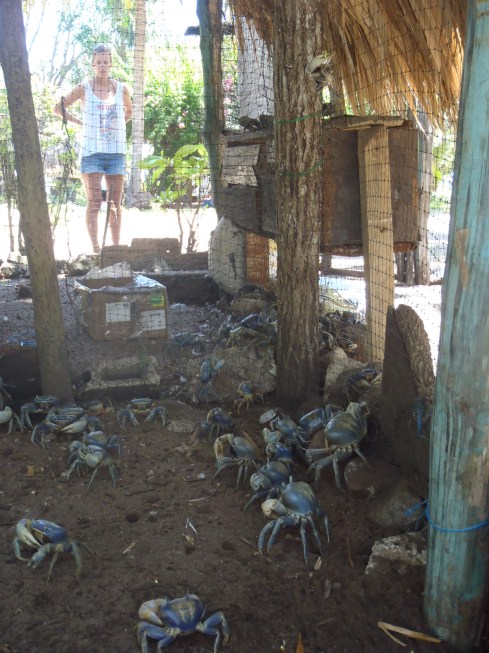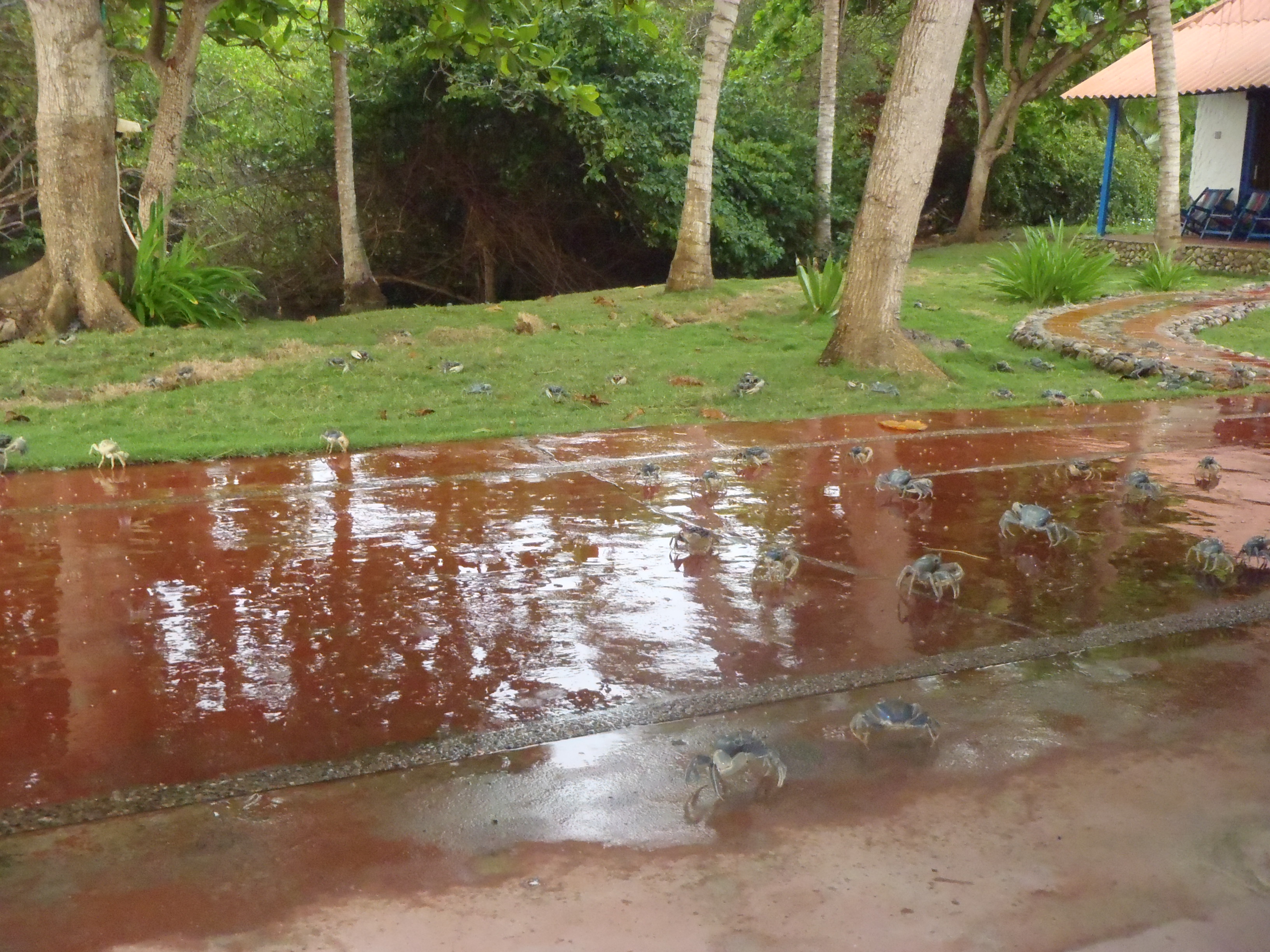 A very odd thing to get used to in Palomino is the abundance of crabs. Literally hundreds of them, scurrying around everywhere, all day. One day, when Denise fed the chickens scraps of corn, and suddenly the chicken coop was suddenly inundated with the scavengers.